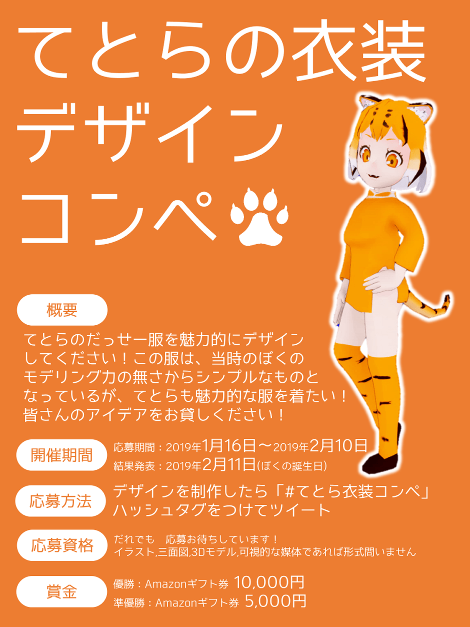 みなさんこんにちは! 「てとらの衣装デザインコンペ」について、権利など明示していますので最後まで読んだ上で参加の方をよろしくおねがいします!